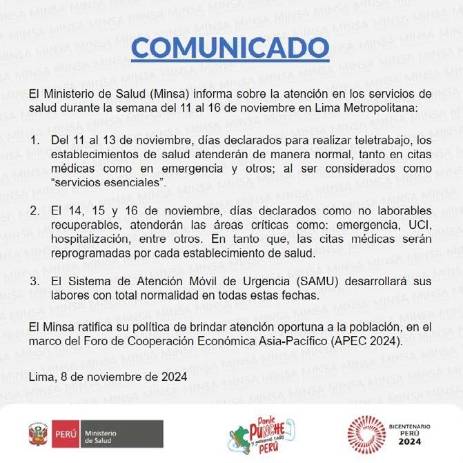 En el caso del Sistema de Atención Móvil de Urgencia (SAMU) desarrollará sus labores con total normalidad del 11 al 16 de noviembre. En la parte final del comunicado el Minsa ratifica su compromiso con brindar atención oportuna a la población en el marco del APEC.