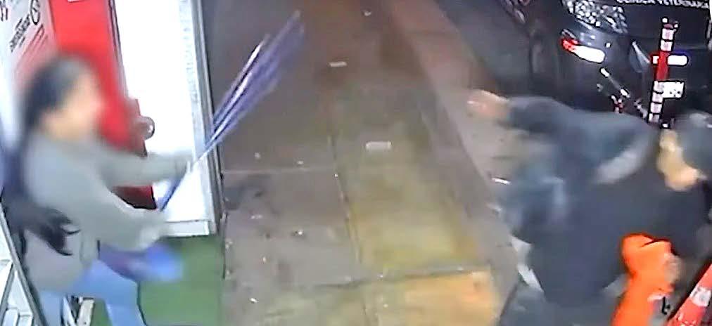CuCHillo en Mano Momentos después regresa con un cuchillo en la mano para asaltar el local, es ahí que una de las trabajadoras agarra una escoba y empieza a golpear al facineroso, mismo que termina huyendo del establecimiento.
