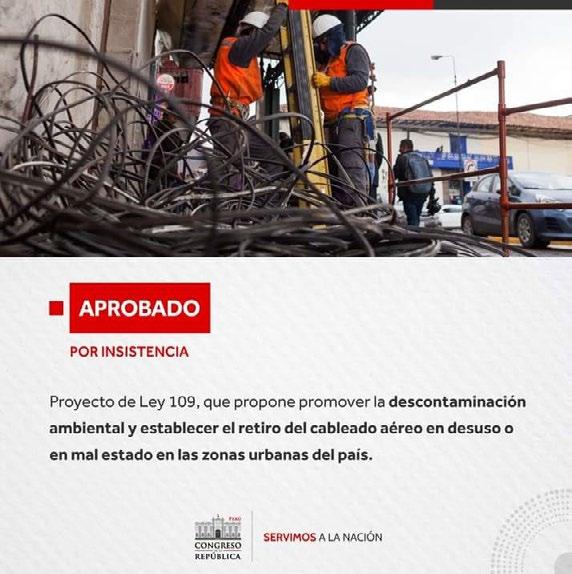 Con111 votos a favor, el Pleno del Congreso de la Repúbli ca aprobó por insisten cia el proyecto de ley 109 que establece el retiro obligatorio de los cables aéreos en mal estado o desuso, sin que ello represente un costo para el usuario.