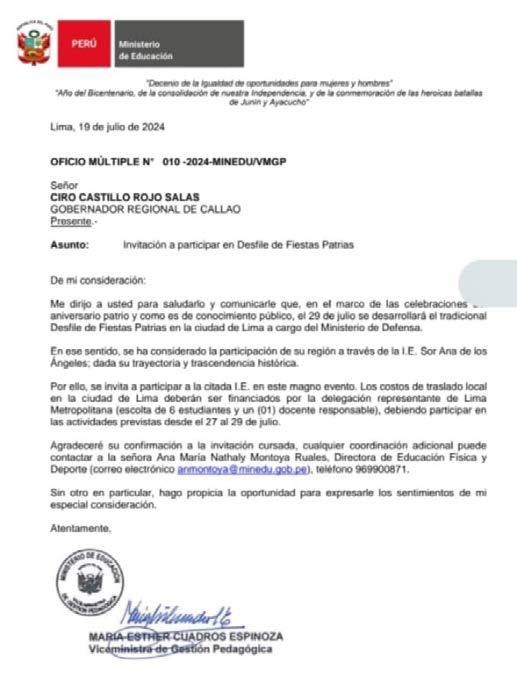 con fecha 19 de julio, del Ministerio de Educación (Minedu) estaba dirigida al colegio Sor Ana de los Ángeles; es decir, mucho antes de que se iniciara el desfile regional del Callao.
