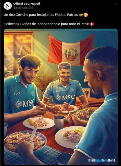 En Italia, el Napoli posteó “Un rico Ceviche para festejar las Fiestas Patrias ¡Felices 203 años de independencia para todo el Perú!”, imagen que tenía a tres de sus jugadores comiendo ceviche.