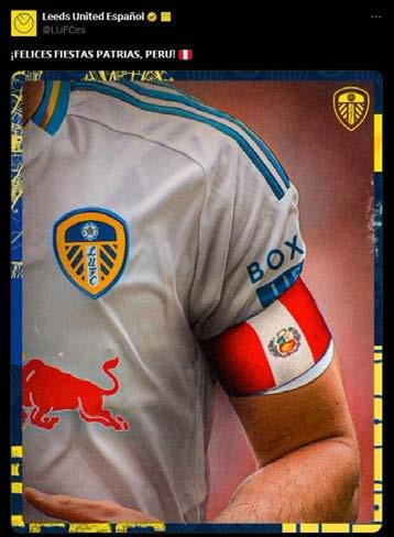 bandera nacional en la pantalla del estadio de Turín: “¡Feliz 28! ¡VIVA EL PERÚ!”. Asimismo, desde Inglaterra, Leeds United publicó una foto de su camiseta con la banda de capitán que no era otra que la bandera peruana.