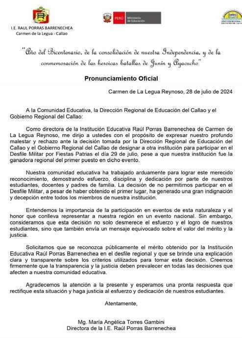 “Como directora de la Institución Educativa Raúl Porras Barrenechea de Carmen de La Legua Reynoso, me dirijo a ustedes con el propósito de expresar nuestro profundo malestar y rechazo ante la decisión tomada por la Dirección Regional de Educación del Callao y el Gobierno Regional del Callao de designar a otra institución para participar en el Desfile Cívico Militar por Fiestas Patrias el día 29 de julio, pese a que nuestra institución fue