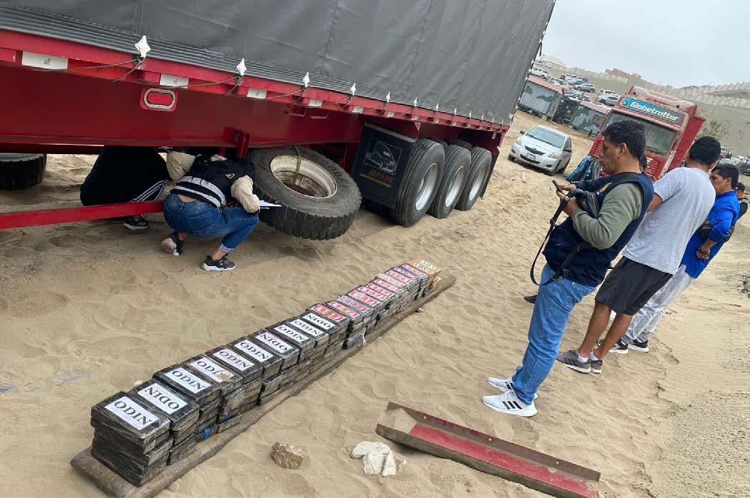 La Policía Nacional del Perú y la Segunda Fiscalía Provincial Corporativa Especializada en Tráfico Ilícito de Drogas del Callao lograron una importante intervención la madrugada de este viernes 6 de diciembre, en la que se incautaron 730 paquetes de clorhidrato de cocaína, camuflados en la estructura de la carreta de un tráiler.