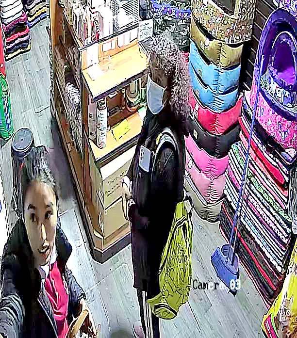 Como se aprecia en las imágenes de la cámara de seguridad, la mujer se encuentra dentro de la tienda de ropa y accesorios para animales. Pregunta por el precio de unas correas mientras la vendedora se acerca para enseñarle los
