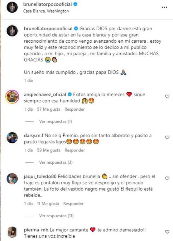 sus seguidores. “Gracias Dios por darme esta gran oportunidad de estar en la Casa Blanca y por ese gran reconocimiento de cómo vengo avanzando en mi carrera”, escribió en un primer momento Brunella.