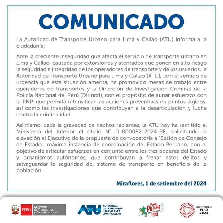 Mediante un comunicado, la ATU indicó que, ante esta situación, resulta urgente “esfuerzos articulares en conjunto entre los tres poderes del Estado y organismos autónomos, que contribuyan a frenar estos delitos y salvaguardar la seguridad del sistema de transporte en beneficio de la población”.