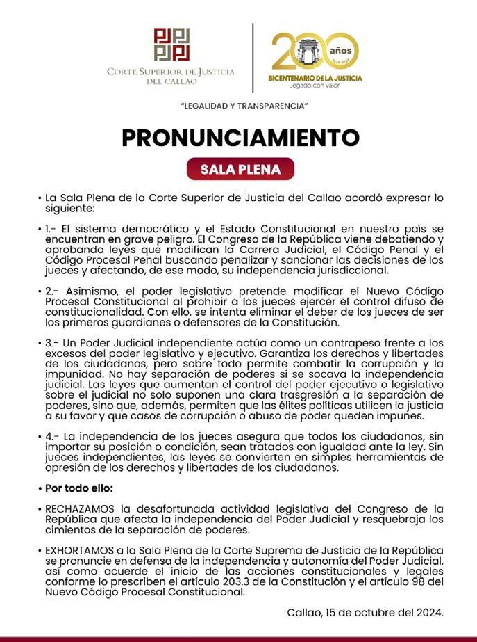 La Sala Plena de la Corte Superior de Justicia del Callao emitió un pronunciamiento en el que rechaza el accionar del Congreso de la República al debatir y aprobar leyes que “afectan la independencia del Poder Judicial” y vulneran la separación de poderes. “El sistema democrático y el Estado Constitucional en nuestro país se encuentran en grave peligro. El Congreso de la República viene debatiendo y aprobando leyes que modifican la Carrera Judicial, el Código Penal y el Código Procesal Penal buscando penalizar y sancionar las decisiones de los jueces y afectando, de ese modo, su independencia jurisdiccional”, cuestionó.