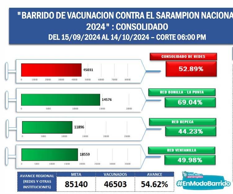 Más de 46 mil pequeños de 1 a 6 años han sido vacunados contra el sarampión en el primer puerto, hasta el último 14 de octubre, en un esfuerzo conjunto entre las brigadas de las tres redes de salud de la Dirección Regional de Salud (Diresa) del Callao. Esto representa un avance del 54.52% de inmunización contra esta enfermedad muy contagiosa. “Vacuna a tus hijos en la
