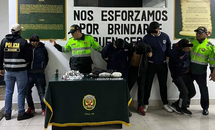 La intervención se realizó en la intersección de la calle Los Cedros con la avenida Quilca, donde fueron detenidos Luis Toribio Heros, alias “Chicago” (cabecilla), junto a Pedro Soria, alias “Cholo”, Luis Rutty, alias “Veneco”, Aaron Salazar, alias “José”, y Esteban Carranza, alias “Fabio”. Durante el registro, se halló una pistola con la serie borrada, municiones, 60 ketes de pasta básica de cocaína, envoltorios de clorhidrato de cocaína y tres celulares.