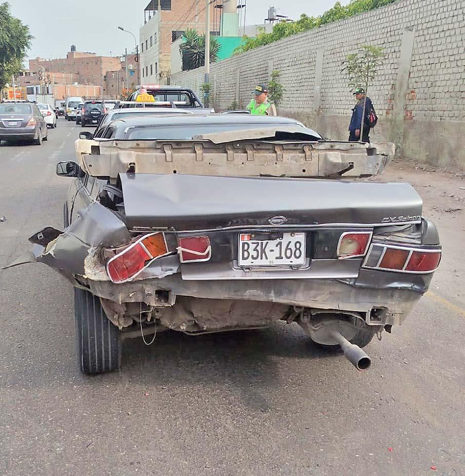 093, siendo Jesús Sánchez Alarico quien se encontraba al volante. Afortunadamente, los tres conductores no presentaron daños. El último auto es un Nissan Exsaloon plomo con placa B3K-168, cuyo chofer era Emerson Nicolás Torres. Esta unidad fue la más perjudicada, ya que al encontrarse al medio de los otros vehículos terminó con daños tanto en la parte delantera como la trasera. Hasta el lugar se trasladaron los efectivos policiales de la comisaría Ramón Castilla así como el personal de Serenazgo para llevar a cabo las diligencias correspondientes. Cabe señalar que hasta el momento no se sabe cómo inició este triple choque, por lo que las investigaciones quedarán a cargo de las autoridades para esclarecer el caso.