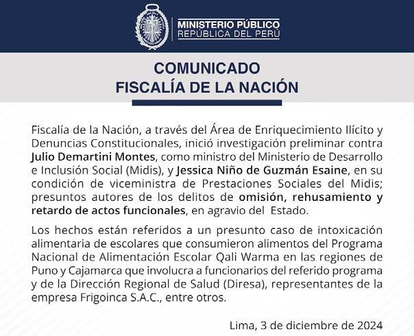 La Fiscalía de la Nación dio inicio a investigación preliminar contra el ministro de Desarrollo e Inclusión Social (Midis), Julio Demartini, y la viceministra de Prestaciones Sociales de la misma cartera, Jéssica Niño de Guzmán, por los delitos de omisión, rehusamiento y retardo de actos funcionales.