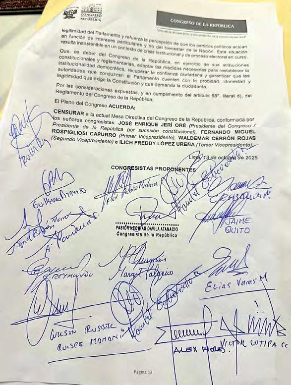 Entre los firmantes de la moción figuraban los congresistas Alfredo Pariona, Pasión Dávila, Jaime Quito, Silvana Robles y Ruth Luque, quienes manifestaron que la actual directiva “no representa el equilibrio ni la transparencia que el país necesita”.