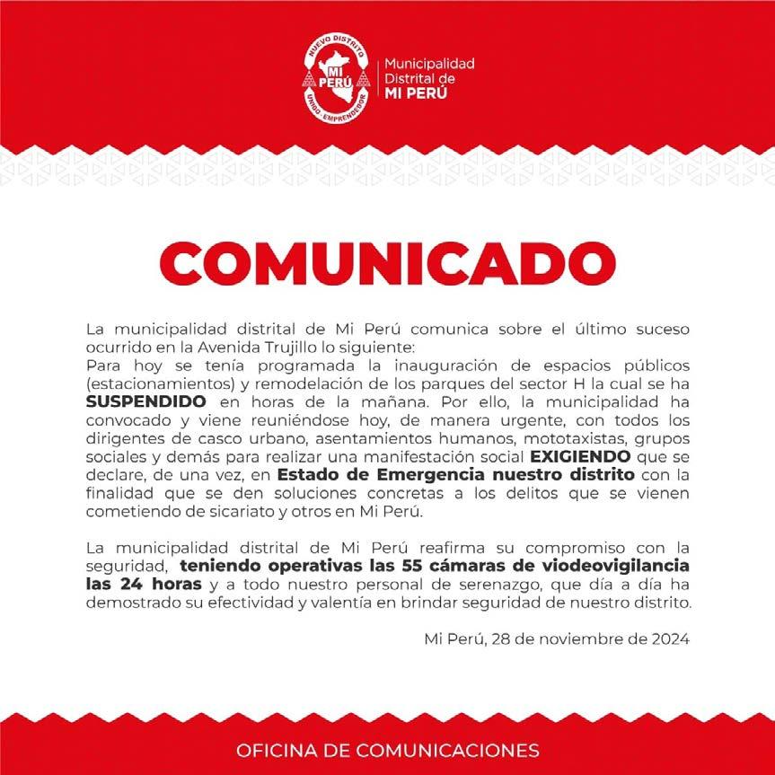En el mensaje, también aseguraron que el pedido de esta medida es para que “se den soluciones concretas a los delitos que se vienen cometiendo de sicariato y otros en Mi Perú”. Además, el municipio recalcó que cuentan con 55 cámaras de videovigilancia operativas las 24 horas y al personal de Serenazgo para velar por la seguridad de los vecinos.