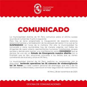 “Por ello, la municipalidad ha convocado y viene reuniéndose hoy, de manera urgente, con todos los dirigentes de casco urbano, asentamientos humanos, mototaxis, grupos sociales y demás, para realizar una manifestación social exigiendo que se declare, de una vez, en estado de emergencia nuestro distrito”, indicaron a través de un comunicado publicado en sus redes sociales este jueves 28 de noviembre.