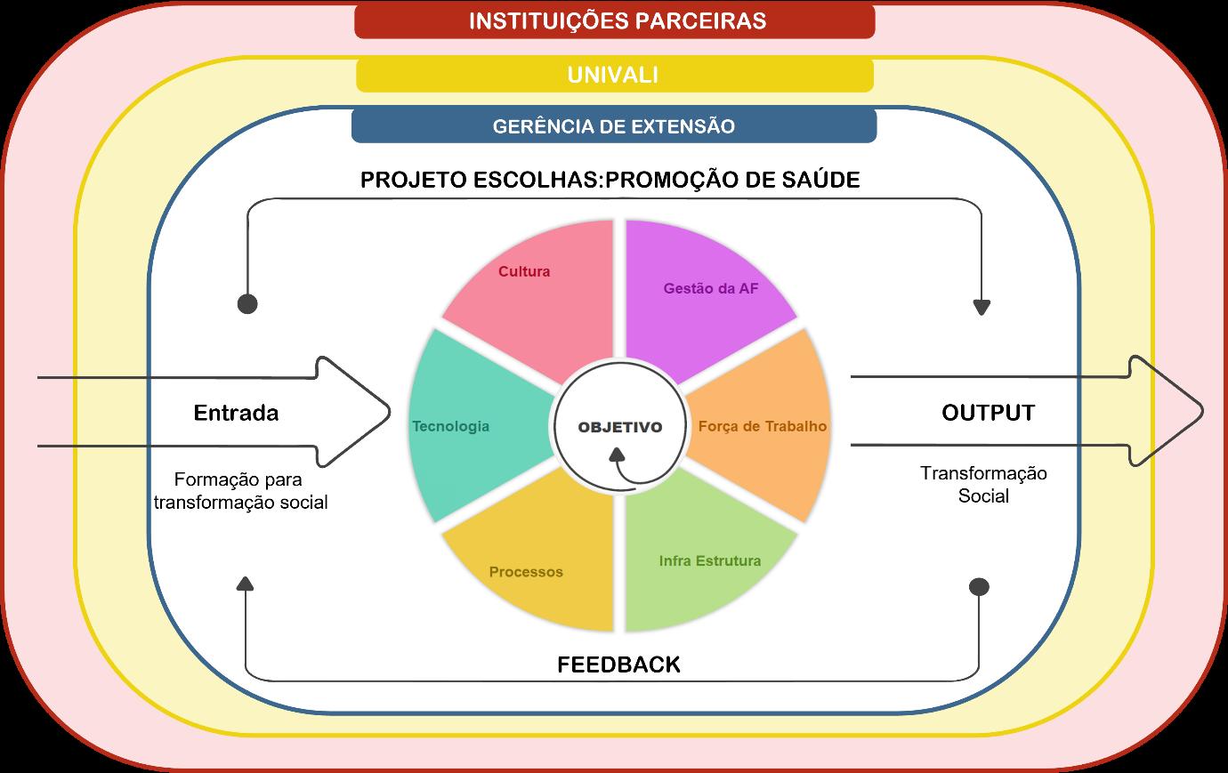 O sistema sociotécnico do escolhas foi identificado como sistema meio ambiente (Cenário). Partes interessadas: gestão da universidade, gestores e equipe técnica do setor de extensão universitária, gestores da escola de ciências da saúde e da escola de negócios, dos cursos de graduação , professores e acadêmicos dos cursos envolvidos. Financiamento: Fomento de extensão, desenvolvimento sustentável, projetos de inovações, as despesas estão relacionados a carga horaria docente, orientação docente, bolsistas, recursos didático pedagógico. Regulamentação: Segue a Resolução nº7 de 12 de dezembro de 2018, estabeleceu diretrizes para a Extensão na Educação Superior Brasileira, além de estar alinhado às metas dos objetivos de desenvolvimento sustentável.