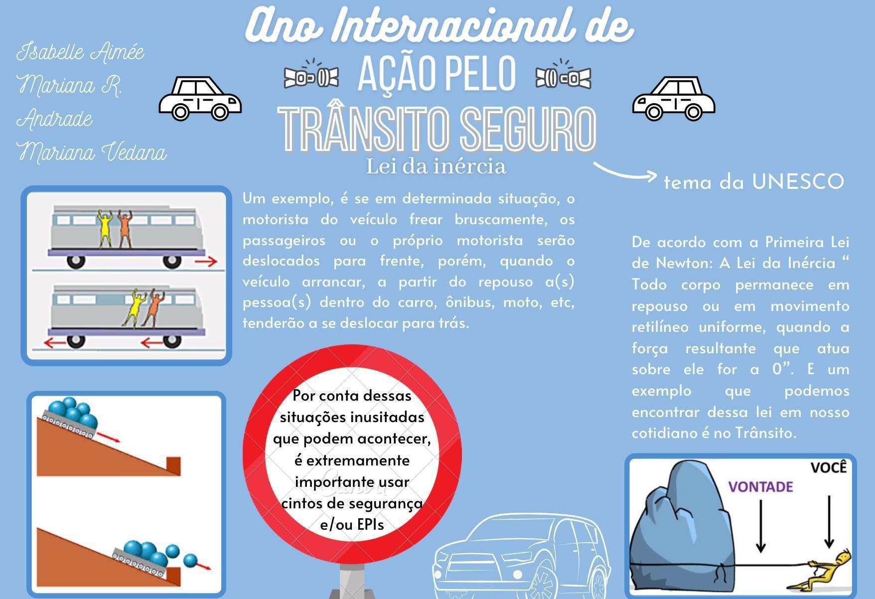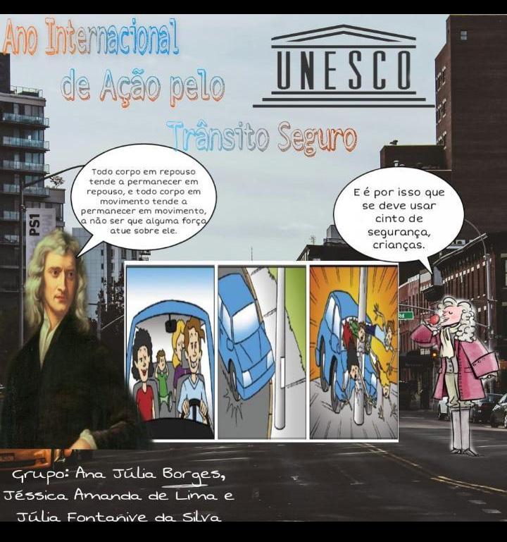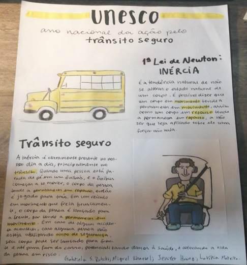 Neste trabalho, os alunos destacaram a Lei da inércia aplicada ao trânsito, como mostra a figura de cima e, também, a importância do uso de cinto de segurança. Em ambas as fotos, o resultado pode ser o pior: um acidente.