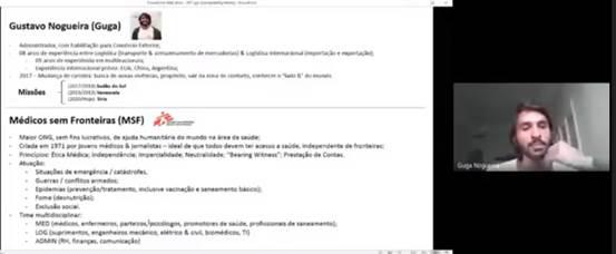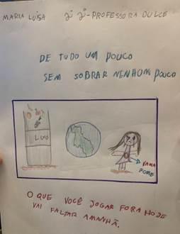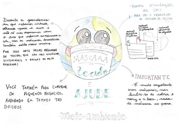 Dessa forma, perceberam, de um lado, exemplos de recuperação da biodiversidade em determinados locais, consequência da diminuição da circulação de pessoas e da emissão de poluentes na atmosfera; de outro, o aumento do consumo em diversos âmbitos da vida cotidiana e o impacto do descarte incorreto de máscaras de proteção. Em seguida, foi lançado o desafio: ilustrar uma campanha de conscientização a partir da reflexão ética acerca desse contexto, vivenciado por todos atualmente. Estes trabalhos foram apresentados nos intervalos das aulas on‑line, entre os dias 13 e 23 de outubro de 2020.