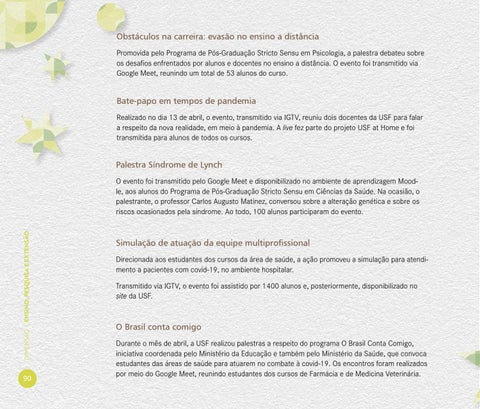 O Brasil conta comigo Durante o mês de abril, a USF realizou palestras a respeito do programa O Brasil Conta Comigo, iniciativa coordenada pelo Ministério da Educação e também pelo Ministério da Saúde, que convoca estudantes das áreas de saúde para atuarem no combate à covid-19. Os encontros foram realizados por meio do Google Meet, reunindo estudantes dos cursos de Farmácia e de Medicina Veterinária.