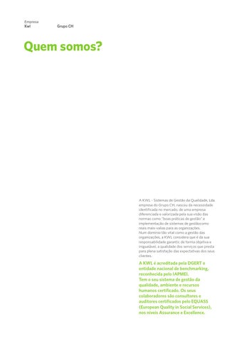 A KWL - Sistemas de Gestão da Qualidade, Lda. empresa do Grupo CH, nasceu da necessidade identificada no mercado, de uma empresa diferenciada e valorizada pela sua visão das normas como “boas práticas de gestão” e implementação de sistemas de gestãocomo reais mais-valias para as organizações. Num domínio tão vital como a gestão das organizações, a KWL considera que é da sua responsabilidade garantir, de forma objetiva e inigualável, a qualidade dos serviços que presta para plena satisfação das expectativas dos seus clientes.
