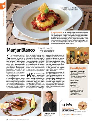 paration, reflect ingredients that are 100 percent organic and local in an effort to highlight the authentic flavors of each ingredient. Compared to other restaurants, at Manjar Blanco in the dishes are prepared only after they are ordered so that it’s possible to retain the freshness of the ingredients, and preserve more of their essences and flavors which diners relish. Among the most representative dishes of this establishment are: Lime Soup, Queso Relleno, Yucatecan potatoes, Temozón smoked beef, papadzules, lomitos de Valladolid and Poc Chuc. Finally, among the desserts you cannot go without trying the delicious Manjar Blanco, which is prepared with thick and sweet coconut cream, sprinkled with ground cinnamon.
