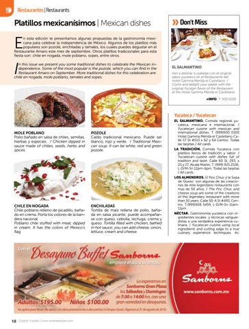 n this issue we present you some traditional dishes to celebrate the Mexican independence. Some of the most popular is the pozole, which you can find in the Restaurant Amaro on September. More traditional dishes for this celebration are: chile en nogada, mole poblano, tamales and sopes.
