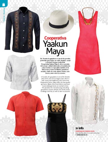 Yaakun Maya En Yucatán, la guayabera es una de las prendas preferidas para lograr un estilo elegante, casual y al mismo tiempo tradicional. Cooperativa Yaakun Maya le ofrece, prendas de la mejor calidad elaboradas artesanalmente a base de lino; se especializa también en la fabricación y venta de filipinas, pantalones, vestidos, chales de seda, zapatos, bolsas, sombreros, entre otros accesorios. In Yucatán, the guayabera is one of the favorite dress shirts worn for its elegant style, which is both casual and traditional at the same time. Cooperativa Yaakun Maya offers the best quality garments. Made of the finest fabrics and these hand-crafted garments are worked in linen. We specialize the manufacturing and selling guayaberas, trousers, dresses, silk shawls, shoes, handbags and hats, as well as other accessories.