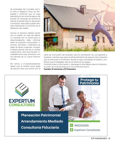 carta de instrucción del acreedor para la cancelación de una garantía o hipoteca, mientras que para el refinanciamiento de pasivos será necesario que la institución o el Infonavit donde se haya contratado el crédito y certifique que el trabajador esté al corriente de sus pagos. Consulta toda la información y descarga la Guía Básica para la Autoconstrucción de Vivienda Segura en www.infonavit.org.mx Fuentes: El Universal y El Financiero
