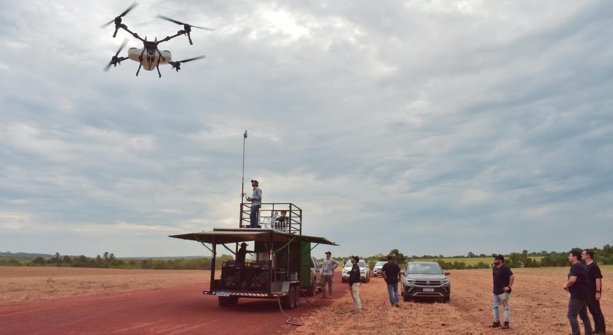 A pista de aterrissagem do drone era demarcada ao lado da estrutura e era o local onde ocorria o pit stop, quando seriam substituídas as baterias e recarregado o depósito de líquido. Este local era constantemente irrigado para reduzir a exposição do equipamento e dos assistentes ao pó durante o processo de decolagem e aterrissagem. Embora nas estruturas houvesse a plataforma para o piloto, com antena, optou-se pela pilotagem no chão, com o piloto coordenando a sua equipe de apoio. Toda vez que era necessário fazer a movimentação da estrutura de um local para outro, havia que configurar o equipamento, buscar a informação da nova área e ativar a estação RTK. A propósito, como era esperado, o sinal e a conexão da Fazenda Conectada Case IH eram excelentes e em nenhum momento prejudicaram o desafio.