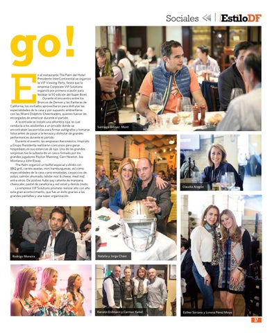 n el restaurante The Palm del Hotel Presidente InterContinental se organizó la VIP Viewing Party, fiesta que la empresa Corporate VIP Solutions organizó por primera ocasión para festejar la 50 edición del Super Bowl. Durante el encuentro entre los Broncos de Denver y las Panteras de California, los invitados aprovecharon para disfrutar las especialidades de la casa y por supuesto ambientarse con las Miami Dolphins Cheerleaders, quienes fueron las encargadas de amenizar durante el partido. A la entrada se instaló una alfombra roja, la cual conducía a los asistentes a un privado donde se encontraban las porristas para firmar autógrafos y tomarse fotos antes de pasar a la terraza y disfrutar de grandes performances durante el partido. Durante el evento, las empresas Aeroméxico, Inspirato y Grupo Presidente realizaron concursos para ganar hospedajes en sus estancias de lujo. Una de las grandes sorpresas fue la subasta de un casco firmado por los grandes jugadores Peyton Manning, Cam Newton, Joe Montana y John Elway. The Palm organizó un buffet especial y drinks con BBQ grill, carnes asadas, mini hamburguesas, así como especialidades de la casa como ensaladas, carpaccios de pulpo, salmón ahumado, lobster mac & cheese, meat loaf, entre otros. De postres hubo pay caliente de manzana, cheescake, pastel de zanahoria y red velvet y demás treats. La empresa VIP Solutions promete realizar año con año este gran acontecimiento, que fue un éxito gracias a las grandes pantallas y una súper organización.
