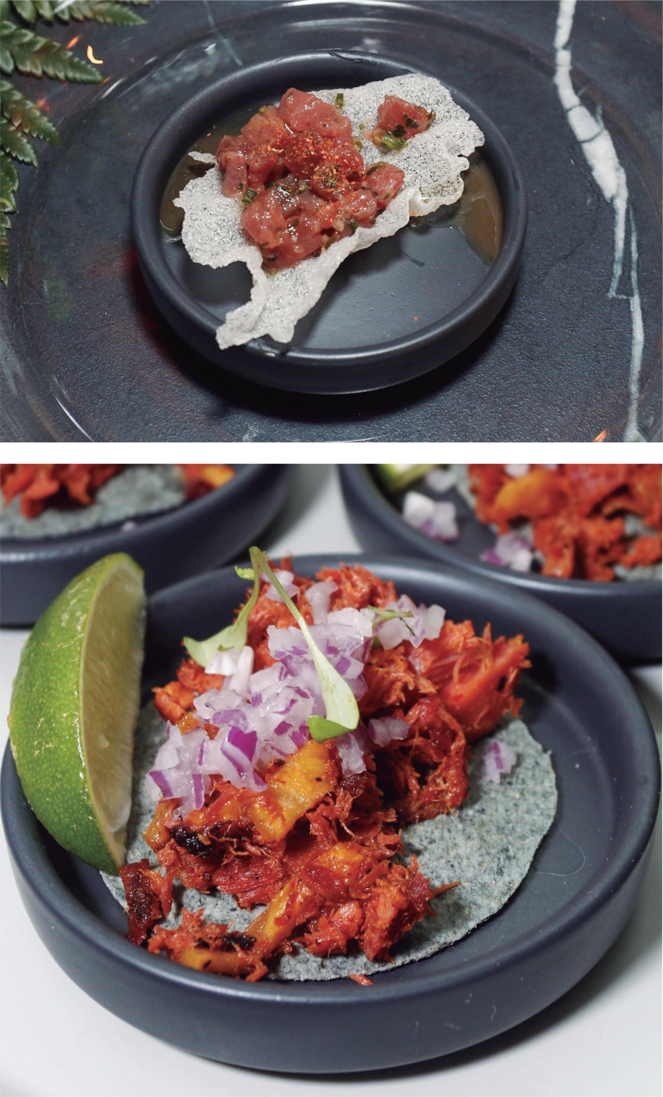 La velada inició con un fresco y aromático aguachile esmeralda de corazón de palmito, acompañado por puré de aguacate, pepino persa y notas de cilantro y cebolla tatemada.