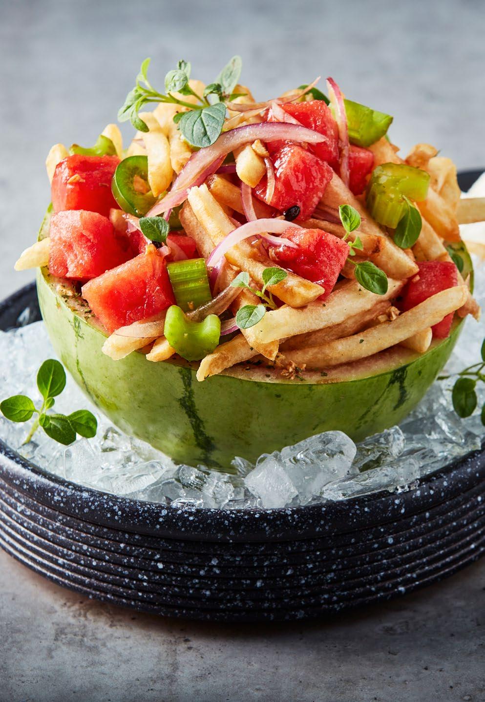 Mezcla el ajo y el orégano con el aceite de coco. Barniza las papas con la mezcla y espárcelas en una charola. Hornea a 180ºC por 15 minutos o hasta que estén crujientes. Mezcla la sandía, apio, jalapeño, cebolla, hierbabuena, vinagre y aceite de oliva. Salpimienta. Sirve en platos individuales. Agrega papas y pon una cucharada de jocoque sobre cada uno.
