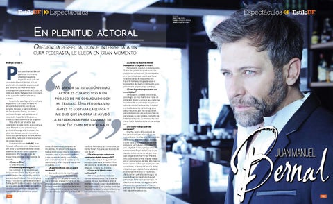 ara Juan Manuel Bernal participar en la cinta Obediencia perfecta, inspirada en la vida del sacerdote Marcial Maciel, el cura pederasta acusado de abuso sexual por decenas de miembros de la congregación Legionarios de Cristo, ha sido uno de los trabajos más complejos a los que se ha enfrentado en su carrera. La película, que llegará a la pantalla el próximo 2 de mayo, se basa en el cuento homónimo escrito por Ernesto Alcocer, y narra la historia de Sacramento Santos, un joven seminarista que será guiado por el sacerdote Ángel de la Cruz en su trayecto para convertirse en religioso. Más allá de ser un actor que solamente se para frente a una cámara, Juan Manuel es una persona cuya profesión le exige adentrarse en los abismos de la actuación, conocer a fondo sus personajes e incluso pensar como ellos, todo con el único objetivo de ser profesional. En entrevista con EstiloDF, Juan Manuel reflexiona sobre el quehacer del actor y su responsabilidad social, además de contar cómo celebrará el próximo año tres décadas de trayectoria artística, y su visión de la muerte. ¿Crees en Dios? Sí, creo en Dios. ¿Profesas alguna religión? Soy católico, el escapulario que traigo no es utilería. Soy alguien que creció dentro de una familia católica que acostumbraba a ir los domingos a misa, e incluso fui parte de la Semana Santa, participaba en carros alegóricos en el pueblo de mi madre; era católico un poco más por tradición que por convicción, pero es curioso que en