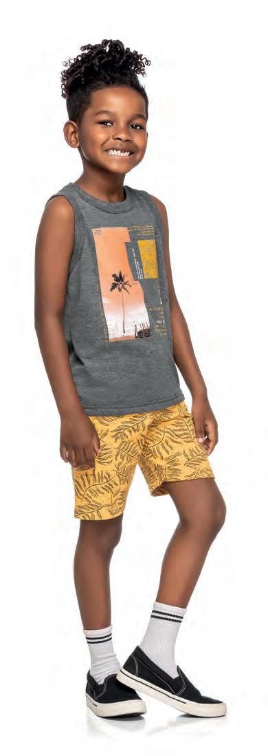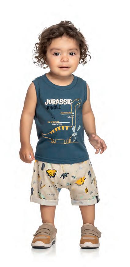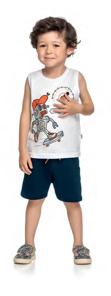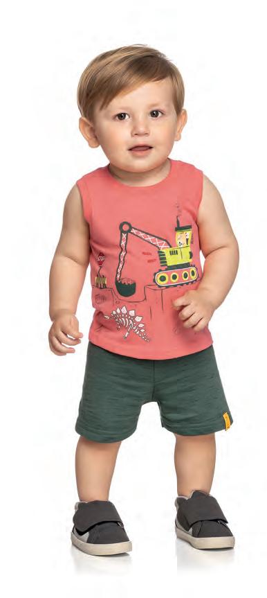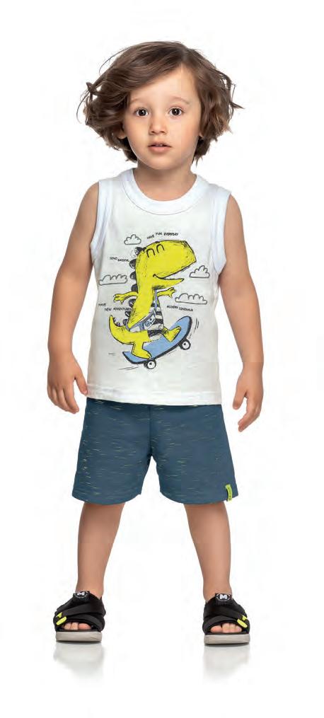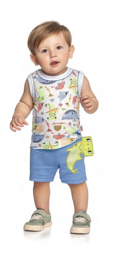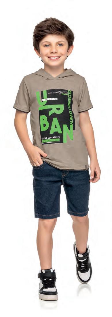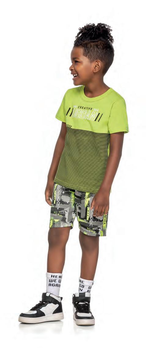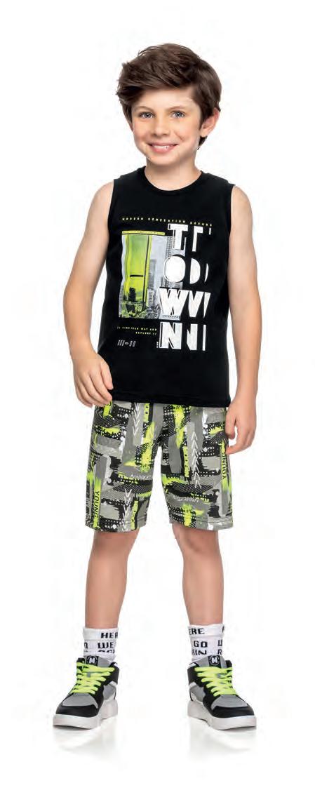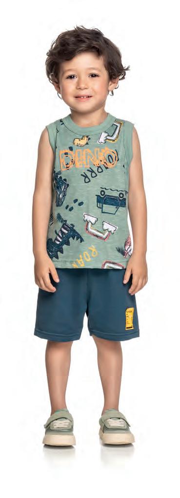 O estilo urbano é o queridinho dos meninos! O conjunto com camiseta, bermuda e colete ganha destaque com cores vibrantes e estampa divertida.