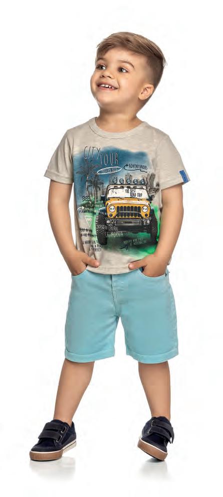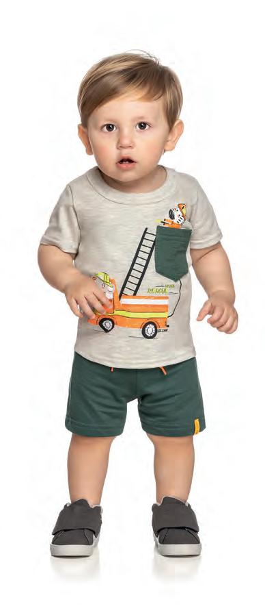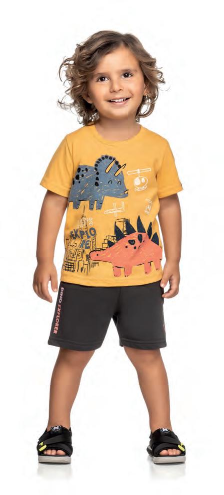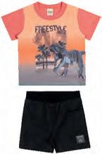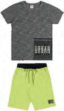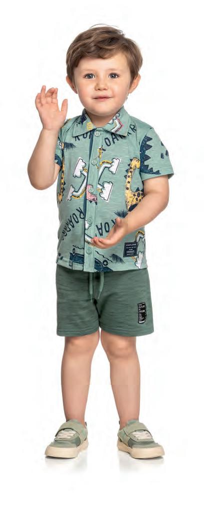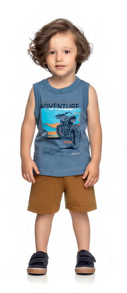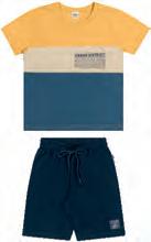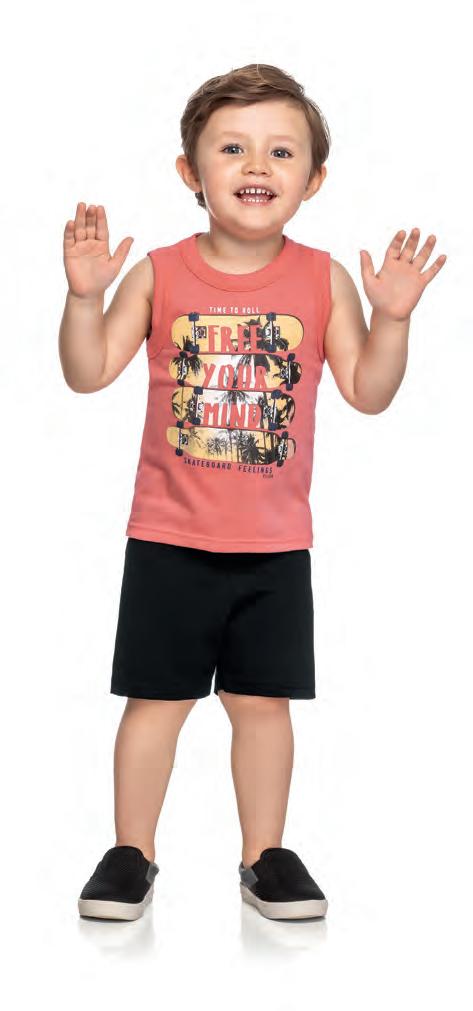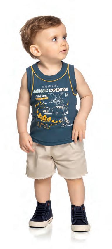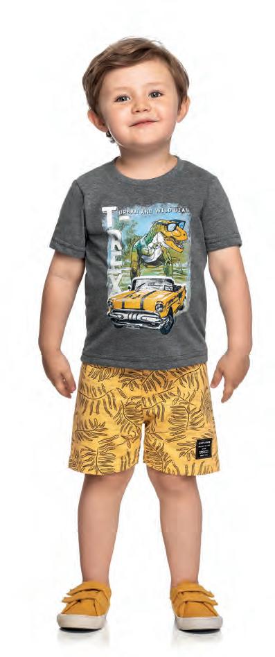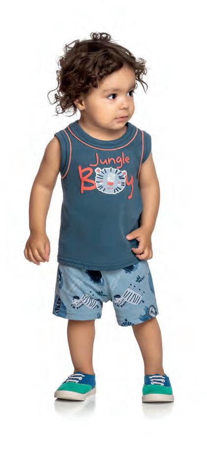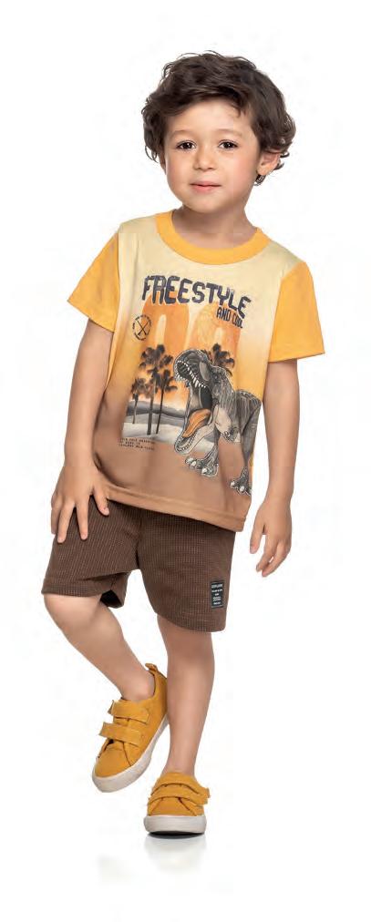 O estilo urbano é o queridinho dos meninos! O conjunto com camiseta, bermuda e colete ganha destaque com cores vibrantes e estampa divertida.