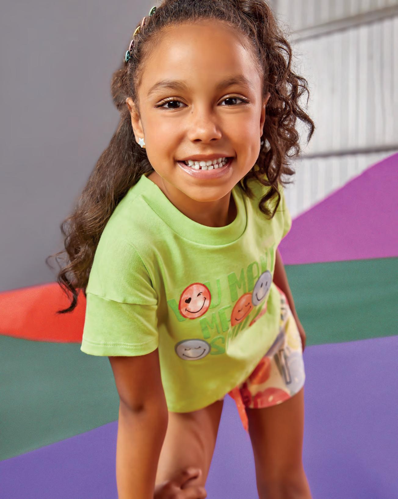 Que tal adicionar um toque moderno ao look? A camiseta traz uma estampa super descolada em neon com aplicação em gel.