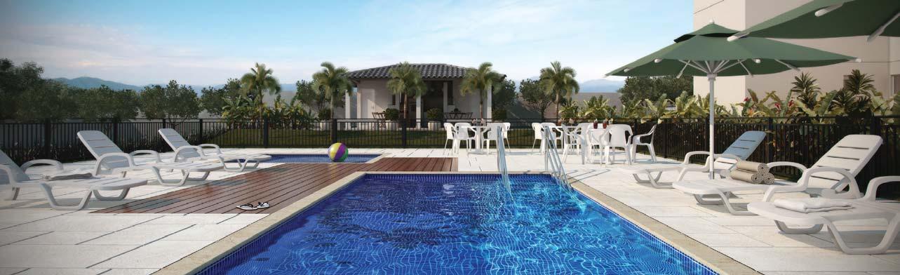 - Conjunto aquático com vista para jardim: raia para nado, piscinas adulto e infantil, deck e duchas;