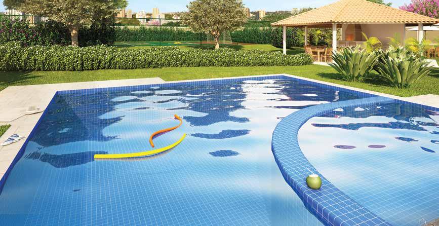 - Conjunto aquático com vista para jardim: raia para nado, piscinas adulto e infantil, deck e duchas;