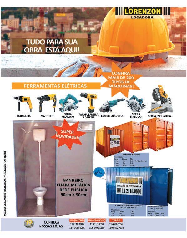 108 (11) 2429-7392 | 11 94379-5327 www.heliomunck.com.br | heliomunck.itu@gmail.com heliomunck | Hélio Remoções e Transportes LTDA Rua Pércio de Teixeira de Carvalho, 53 - Jd. Oliveira | Itu/SP Remoção técnica Carga e descarga Içamento Içamento com cesto aéreo Montagem industrial Locação de empilhadeira Locação de caçamba Locação de containers marítmos Rua Rio Branco, 1043 - Centro - Salto/SP (11) 4028.2500 | www.brindisi.com.br Aceitamos Compre material hidráulico de quem conhece!