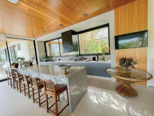 Casa de alto padrão com 4 suítes amplas, sala 3 ambientes aconchegantes com lareira, generoso pé direito duplo com os espaços de lazer integrados e voltados para a piscina aquecida. Ambientes envidraçados bem distribuídos que favorece a iluminação natural.