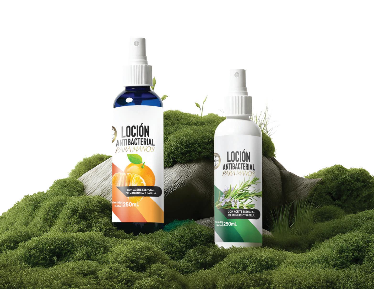 Iones de plata, aceites esenciales de mandarina, sábila y romero.