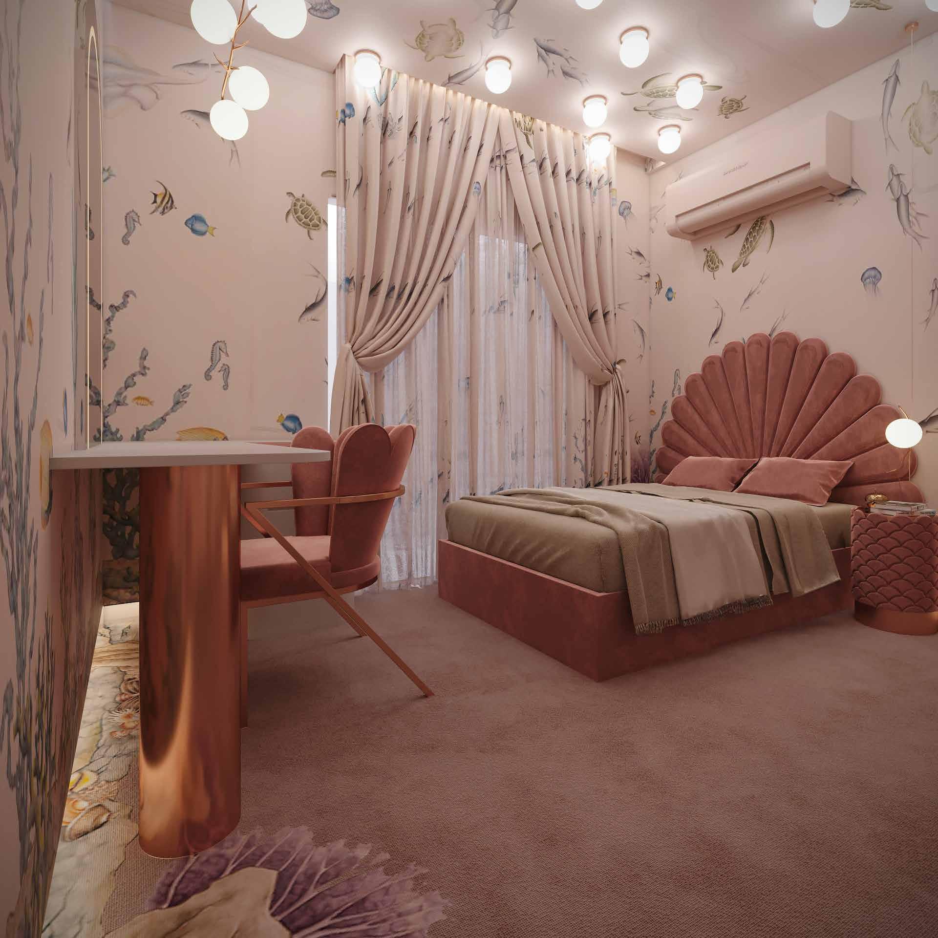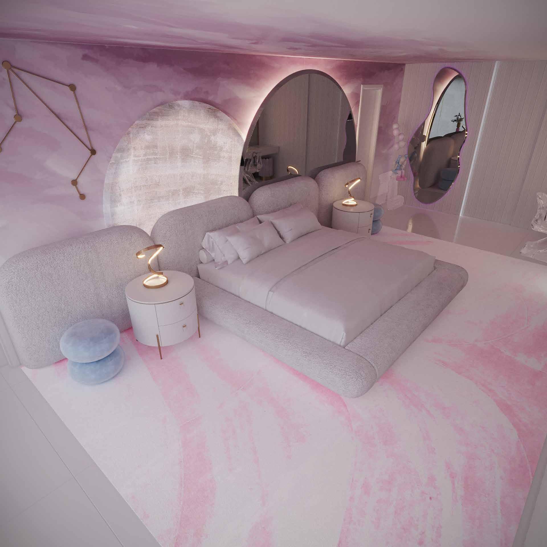 A suíte master da Jade Picon traduz sua personalidade autêntica em um ambiente sofisticado, contemporâneo e repleto de design. O Studio Kaju equilibrou influências nacionais e internacionais para criar uma composição única, onde cada elemento — do papel de parede aos mobiliários exclusivos — foi escolhido para refletir sua essência forte e elegante. As formas orgânicas, além de estarem em alta no design, adicionam fluidez e feminilidade ao espaço, criando uma atmosfera envolvente.