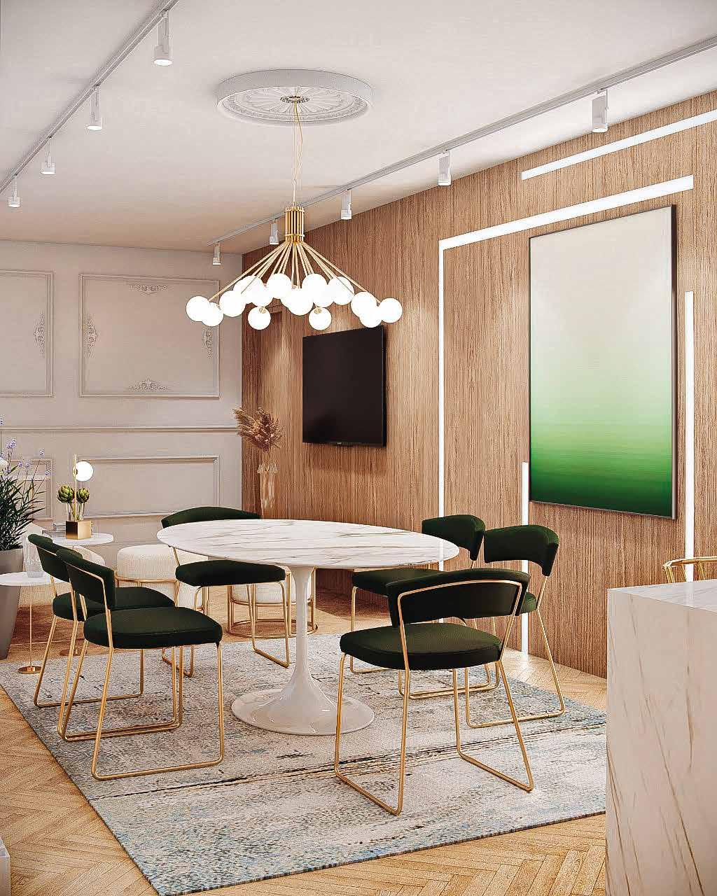 A Classic Residence é a perfeita união entre o clássico e o contemporâneo, onde tradição e modernidade se encontram em equilíbrio. O Studio Kaju reinterpretou elementos atemporais com leveza e sofisticação, garantindo um ambiente elegante sem excessos. As boiseries, presentes em quase todas as paredes, trazem um toque de refinamento, enquanto o piso em paginação chevron adiciona movimento e charme ao espaço. A paleta de tons neutros reforça a atmosfera acolhedora e sofisticada, harmonizando-se com materiais nobres que elevam a estética do projeto. Cada detalhe foi pensado para criar uma experiência visual e sensorial única, refletindo o alto padrão característico do Studio Kaju.