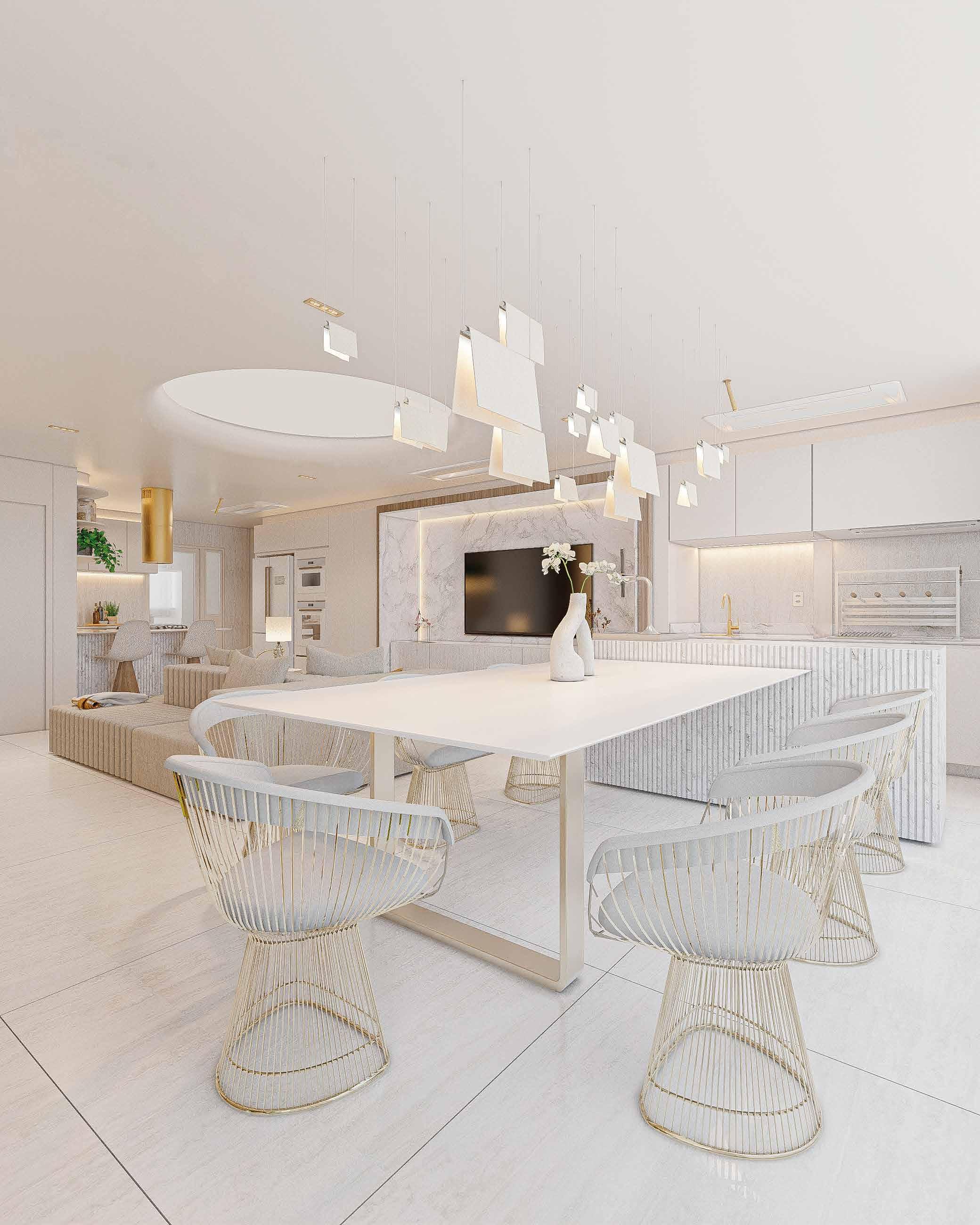 Apresentação Funcional: Mostramos o projeto em 3D em uma versão em branco, permitindo foco na funcionalidade: análise de dimensões, profundidade de armários e alturas de mesas, otimizando o espaço.
