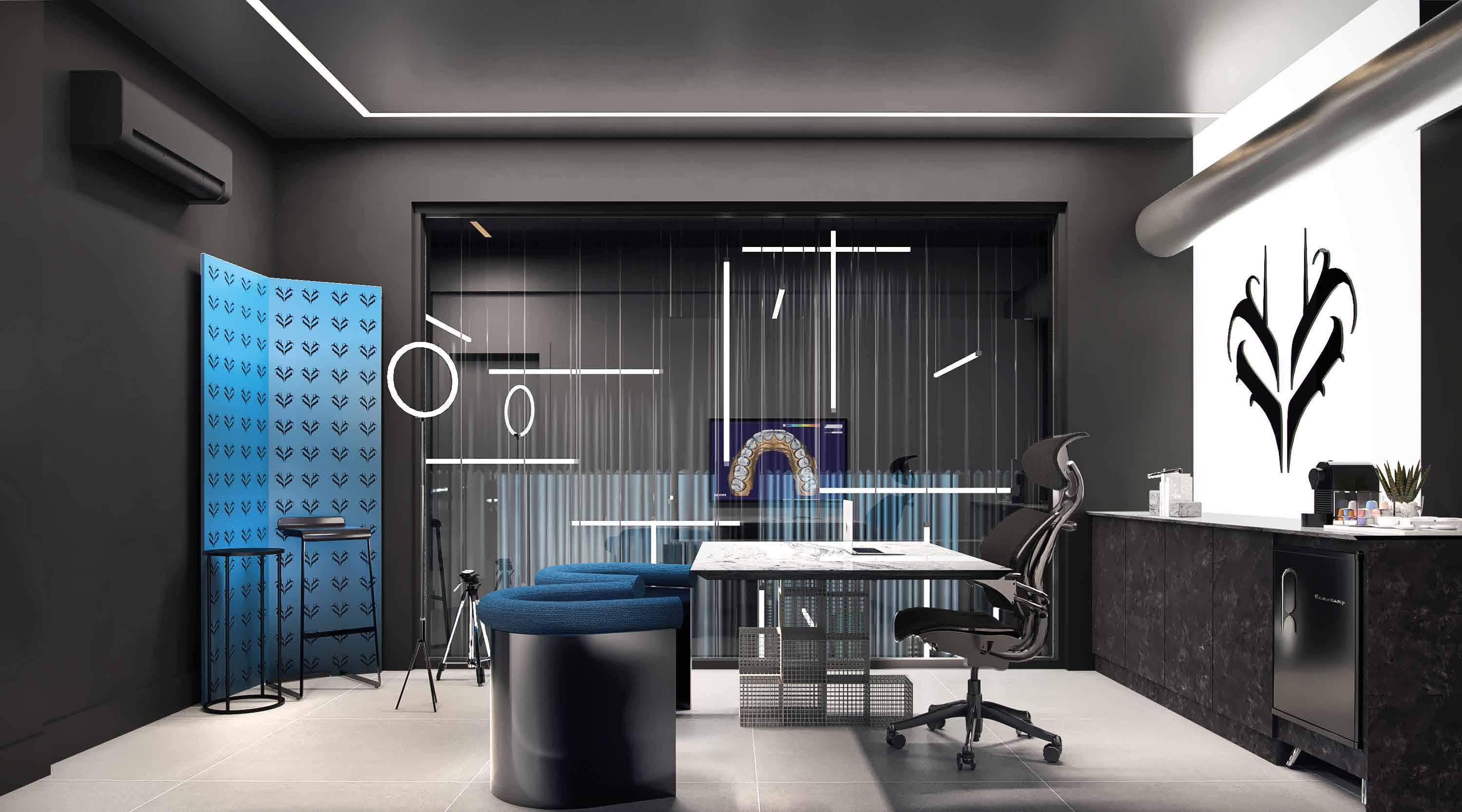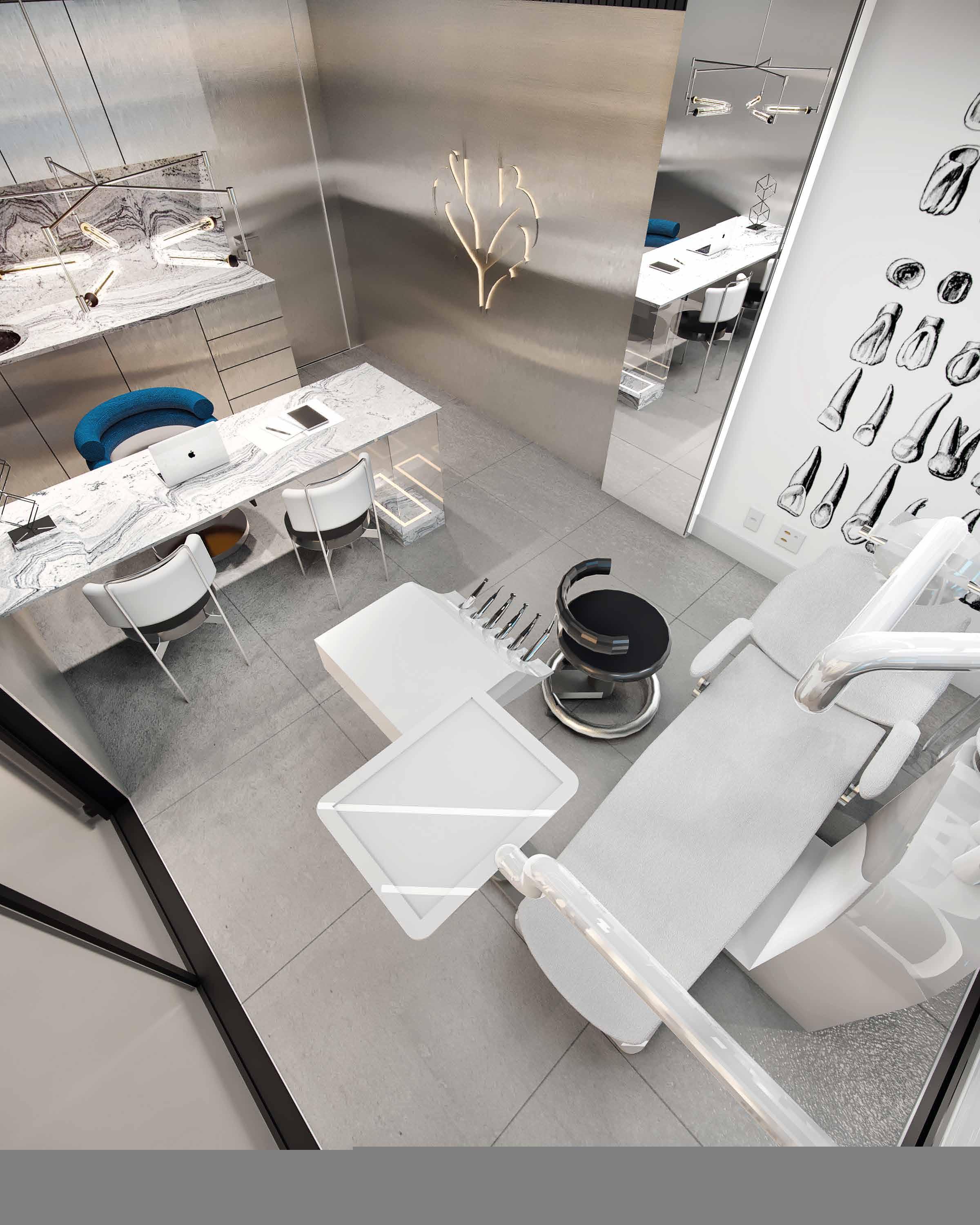 O conceito tecnológico e futurista do espaço é evidenciado pelo uso de materiais metálicos, tons escuros e iluminação em LED, criando uma atmosfera high-tech. A integração de equipamentos digitais avançados e monitores modernos reforça o foco na precisão e inovação, enquanto a iluminação estratégica e as linhas minimalistas realçam o design contemporâneo e sofisticado, refletindo um ambiente voltado para o futuro da odontologia.