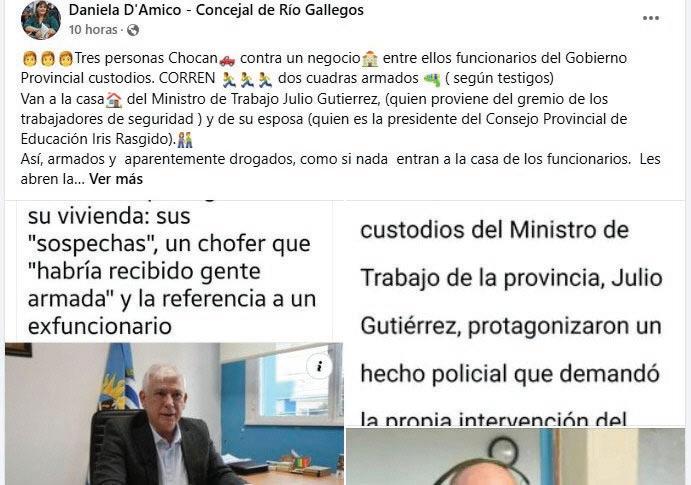 La concejala de Río Gallegos, Daniela D’Amico (UCR), se hizo eco de lo ocurrido este domingo en la vivienda del ministro de Tra‑ bajo Julio Gutiérrez, y de la presi‑ denta del Consejo Provincial de Educación, Iris Rasgido, luego de que personas ligadas al Gobierno de Santa Cruz protagonizaran un choque, con amenazas y porta‑ ción de armas incluidas.