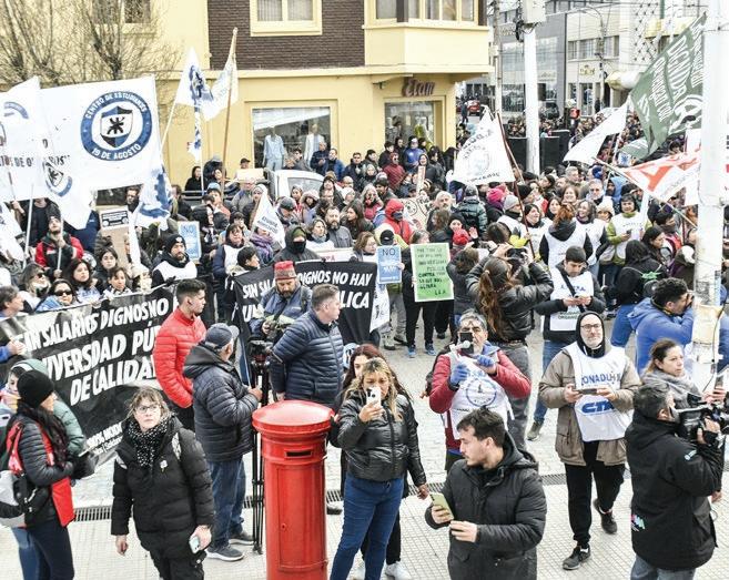 Uno de esos lugares fue Río Gallegos, donde cientos de per‑ sonas, entre estudiantes de la Universidad Nacional de la Pa‑ tagonia Austral (UNPA) y de la Universidad Tecnológica Nacio‑ nal (UTN), docentes, no docentes y público en general se concen‑ traron en las tradicionales esqui‑ nas de “Presidente Néstor Kirch‑ ner” y “Avenida San Martín” para reclamar. Pero también marcha‑ ron en las localidades de Caleta Olivia, Las Heras y Río Turbio,