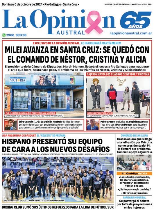 La tapa de La Opinión Aus‑ tral con fotos exclusivas del nue‑ vo comando de LLA generó im‑ pacto, sobre todo entre aquellos que consideran que el local for‑ maba parte del legado político de los Kirchner en Río Gallegos. La rapidez con la que se realizó el traspaso sin que ningún referen‑ te kirchnerista lo anticipara, au‑ mentó aún más la tensión y la bronca