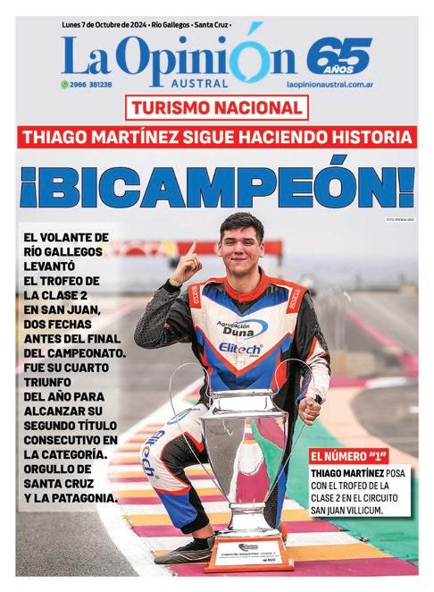 Se mete en la historia grande del automovilismo: el joven volante de Río Gallegos, Thiago Martínez, no tiene techo. Lo viene demostrando hace ya tiempo cada vez que sale a la pista a girar. Se le hizo una costumbre el festejar cada vez que baja de su auto. Celebración que se comparte en la capital provincial, en distintas localidades de Santa Cruz y, por qué no, en toda la Patagonia.