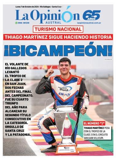 En la madrugada del miérco‑ les 9 de octubre de 2024, Río Gallegos vibró con la llegada de su gran piloto, Thiago Martínez, quien regresó a su tierra natal tras consagrarse bicampeón de la Clase 2 del Turismo Nacional. La expectación era palpable y a la 01:30 de la mañana, una multi‑ tud esperó con entusiasmo en las inmediaciones del Aeropuerto In‑ ternacional Piloto Civil Norberto Fernández, demostrando el cari‑ ño y apoyo incondicional que el piloto ha cosechado a lo largo de su carrera.